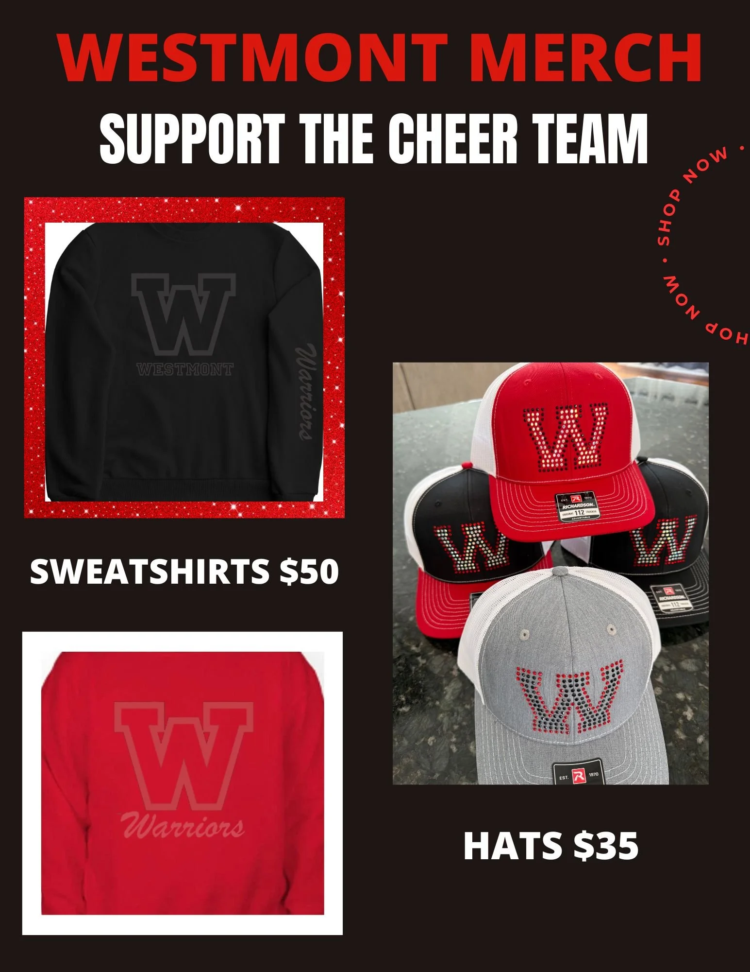 Order your Westmont Swag Here! The cheer team is selling Westmont Sweatshirts and W hats to support our fundraising goal to help us get to Nationals! Buy your spirit wear today!
